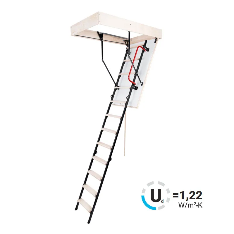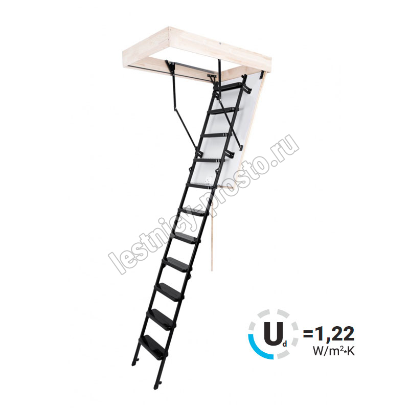 Лестница складная трехсекционная. Рабочая поверхность полностью выполнена из металла и покрашена порошковой краской. Термоизоляционная крышка типа "сэндвич", толщиной 30 мм, утеплена пенопластом, облицована с двух сторон ДCП белого цвета.