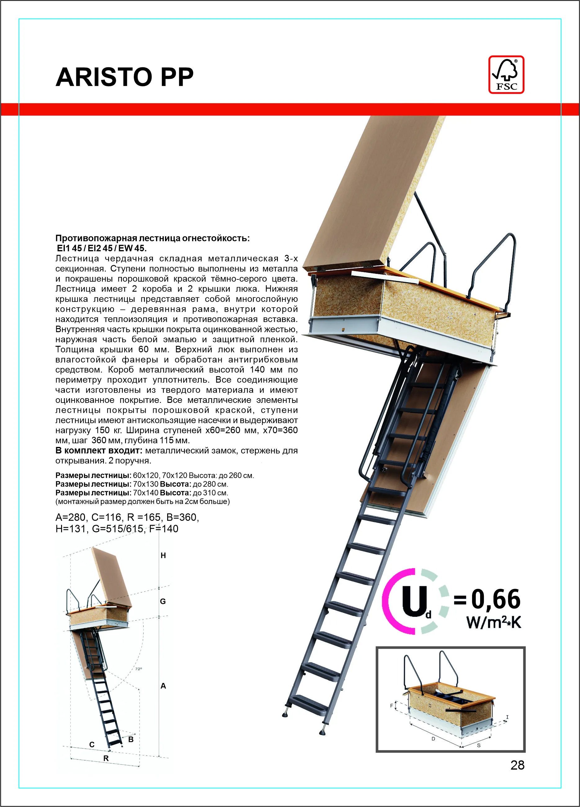 Лестница чердачная складная металлическая 3-х секционная. Ступени полностью выполнены из металла и покрашены порошковой краской. Лестница имеет 2 короба и 2 крышки люка. Нижняя крышка лестницы представляет собой многослойную конструкцию – деревянная рама, внутри которой находится теплоизоляция и противопожарная вставка. Внутренняя часть крышки покрыта оцинкованной жестью, наружная часть белой эмалью и защитной пленкой. Толщина крышки 60мм. Верхний люк выполнен из влагостойкой фанеры и обработан антигрибковым средством. Короб металлический высотой 140мм по периметру проходит уплотнитель. Все соединяющие части изготовлены из твердого материала и имеют оцинкованное покрытие.