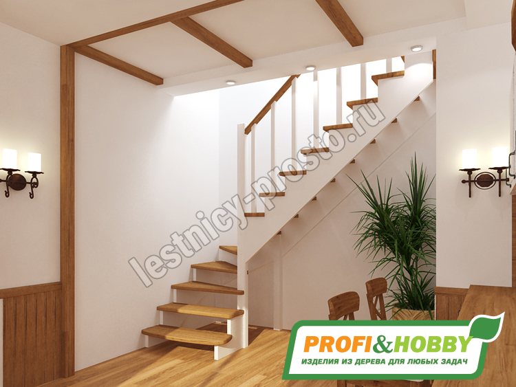 Ступени и поручень лестницы изготовлены из дуба, остальные элементы из сосны. Возможно изготовление модели полностью из дуба. Базовый комплект включает в себя деревянные элементы лестницы и ограждения без какого-либо покрытия. Вы можете заказать у нас профессиональную покраску лестницы в цвета, отвечающие особенностям вашего помещения.