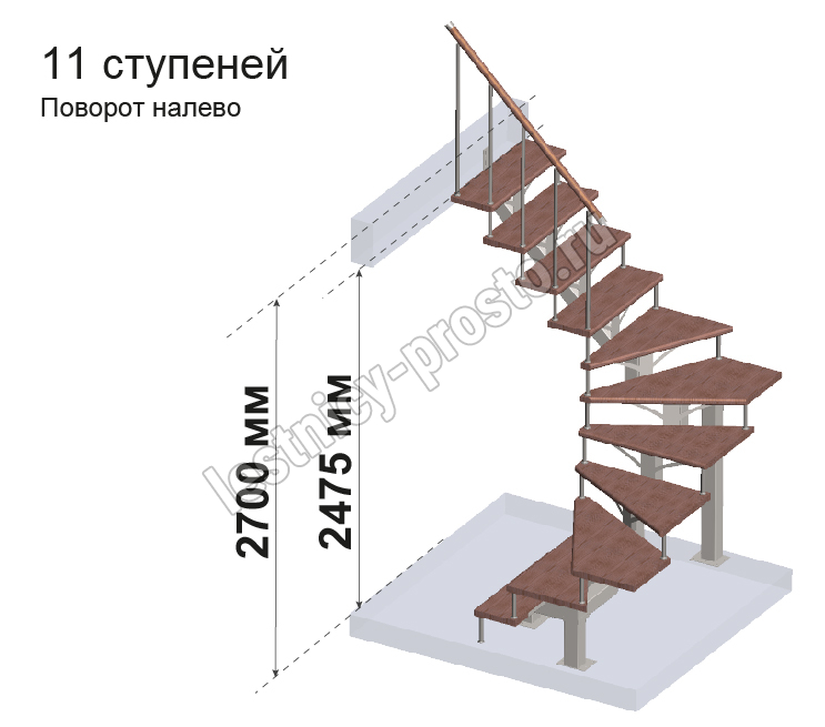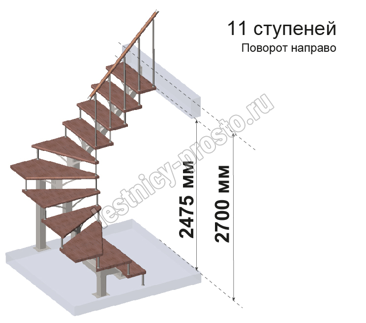 Комплект ограждений для П-образной лестницы MONO h270 из 11 ступеней.
