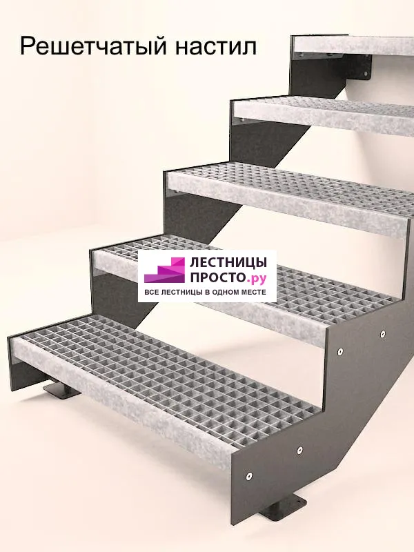 Покрытие порошковое, очень прочное и долговечное. Все детали каркаса крепятся с помощью болтов, благодаря чему Вы можете собрать каркас самостоятельно без применения сварки. В зависимости от ширины лестницы, каркас состоит из двух (ширина до 1 метра) или трех (ширина до 2 метров) опорных балок (тетив).