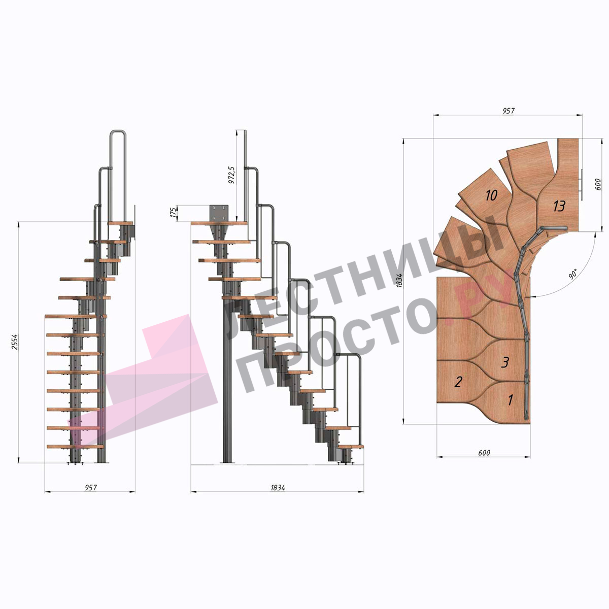 Лестница Prosto Urban Grey г-образная гусиный шаг 600 мм, h234-336 см (13 ступеней)