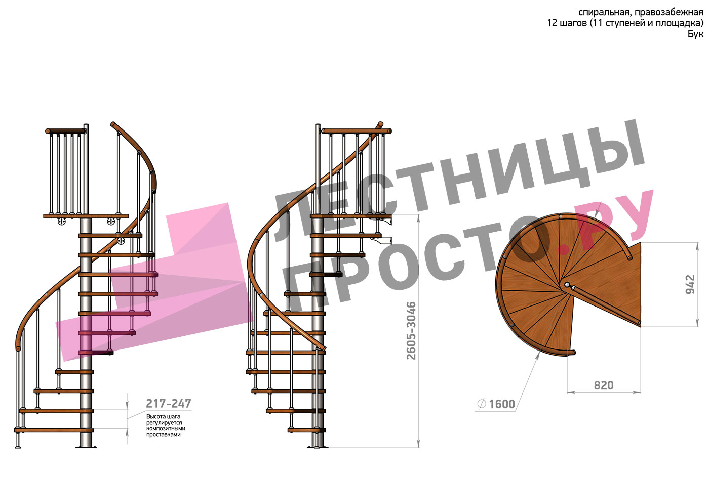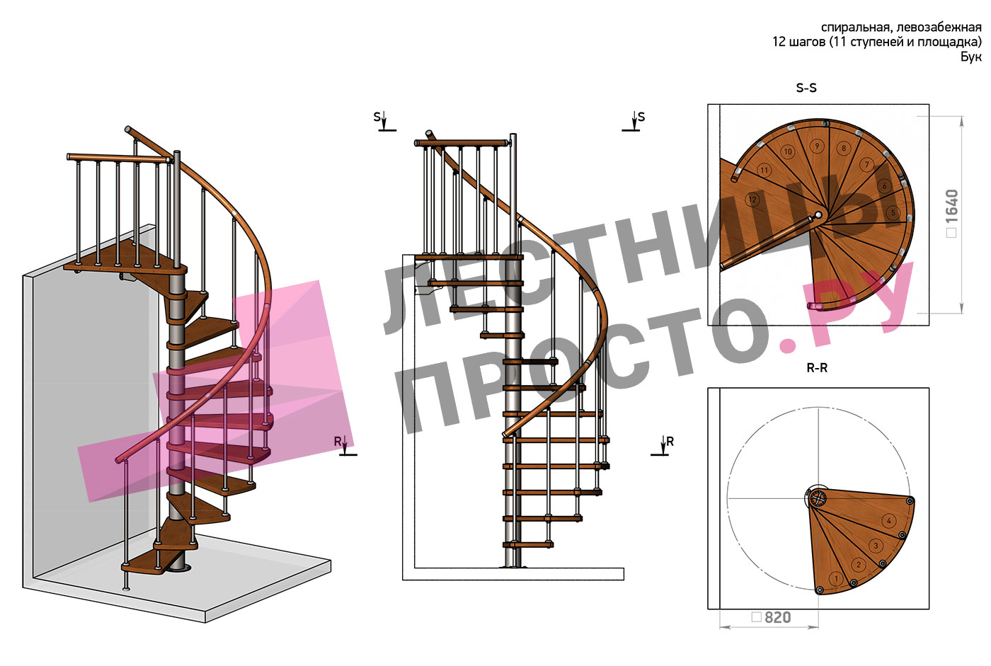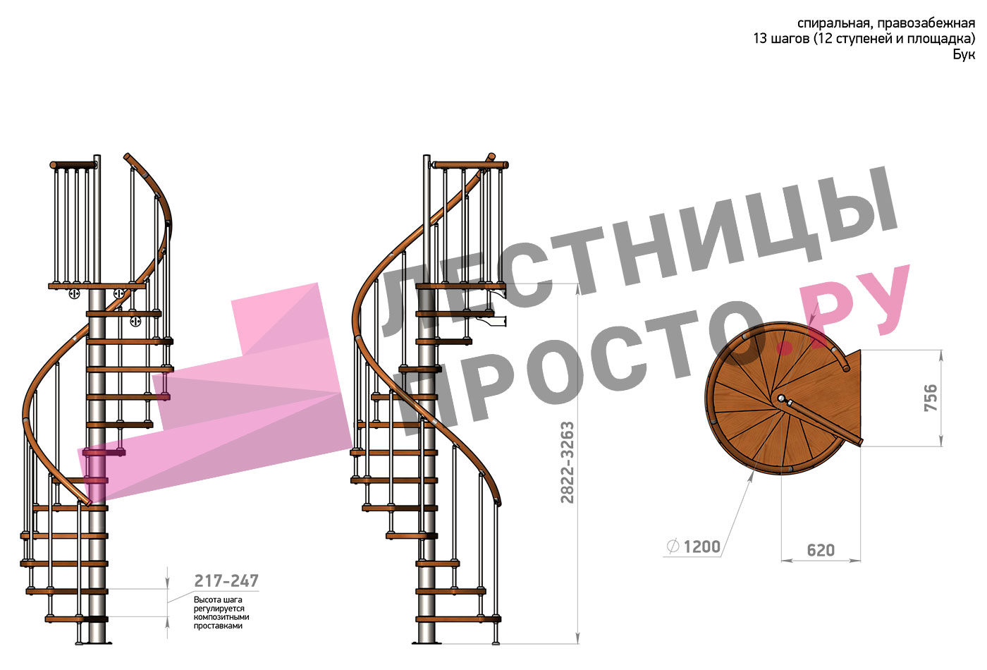 Правая, d=120см, 12 ступеней + площадка