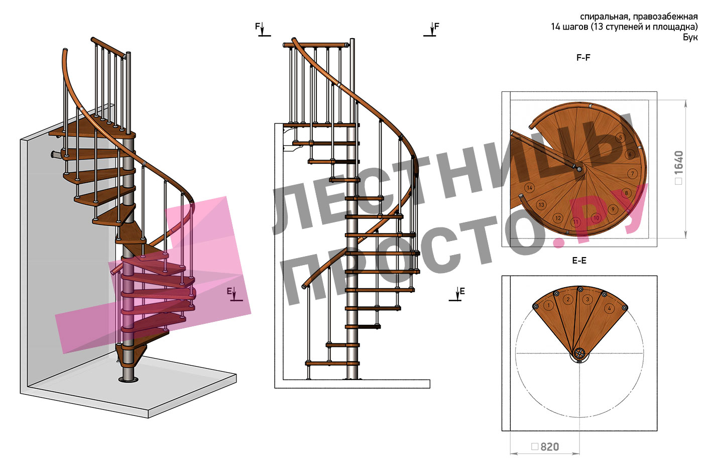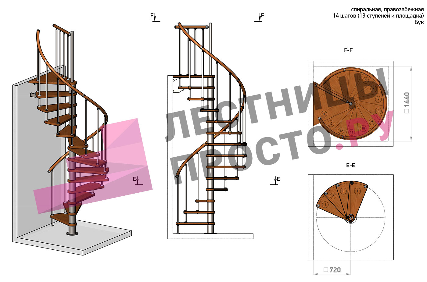 Правая, d=140см, 14 ступеней + площадка