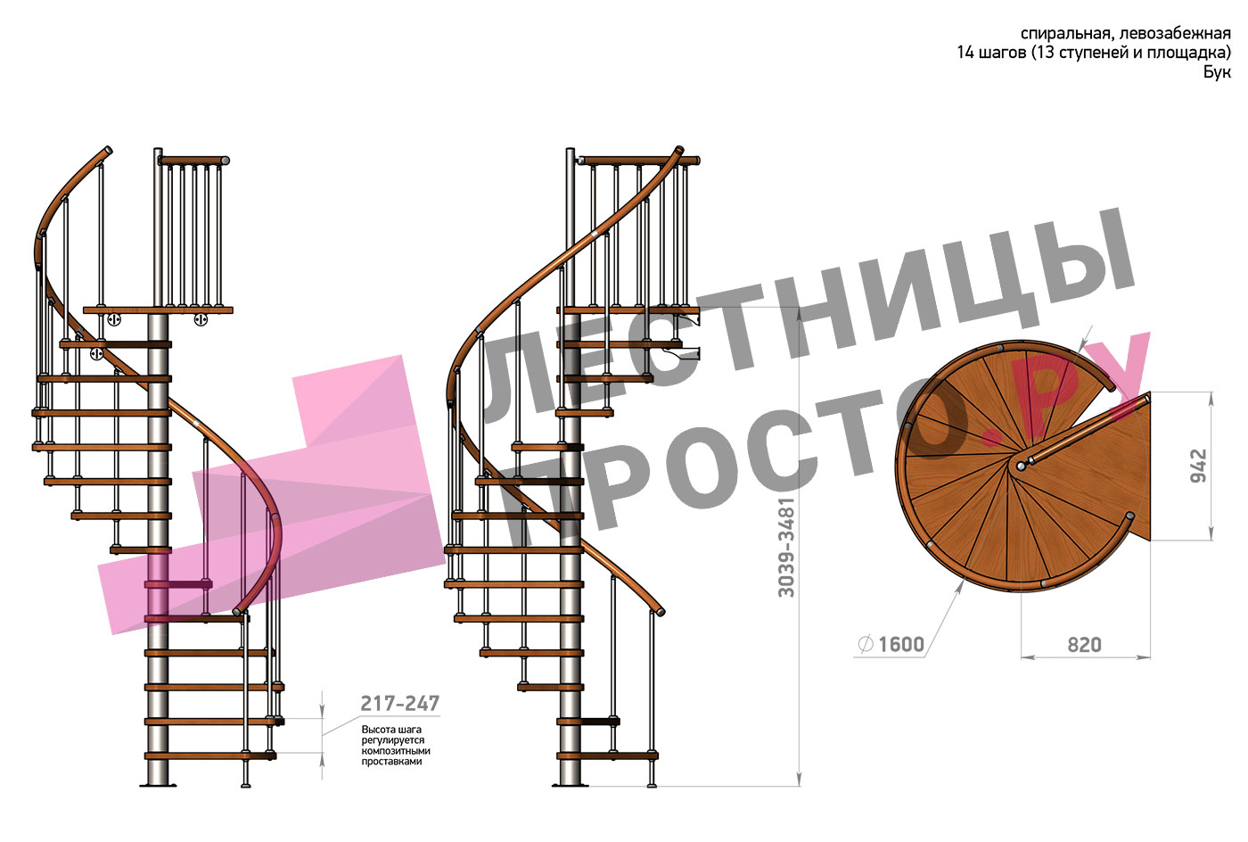 Левая, d=120см, 14 ступеней + площадка