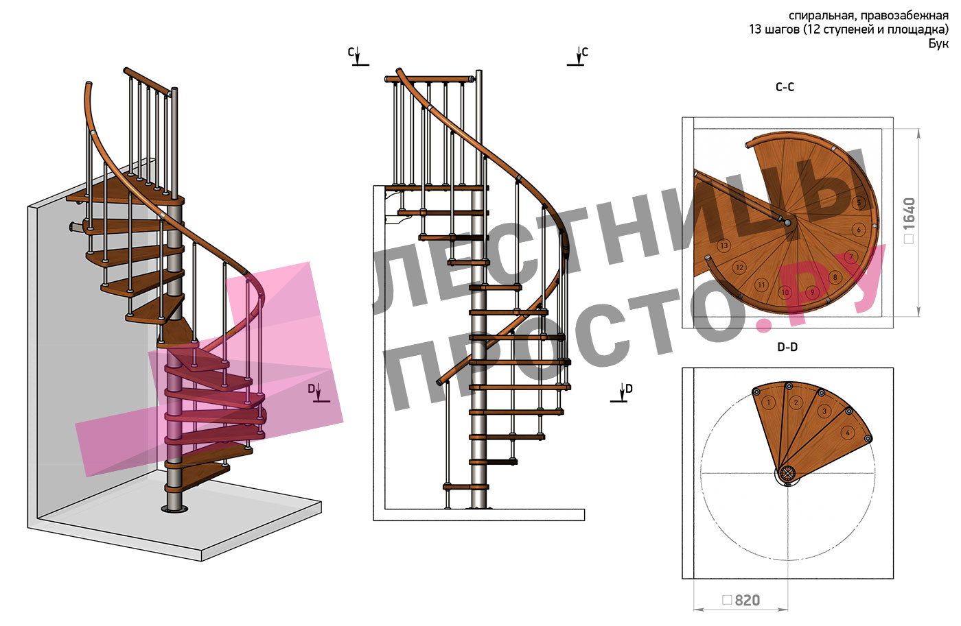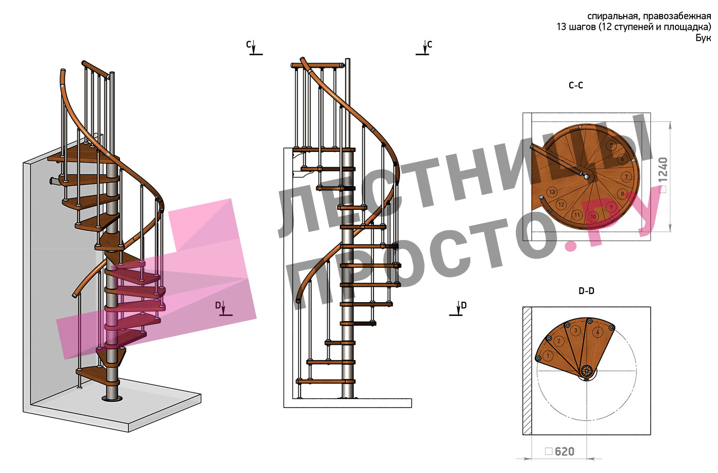 Правая, d=120см, 13 ступеней + площадка