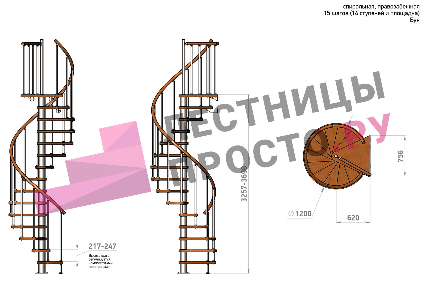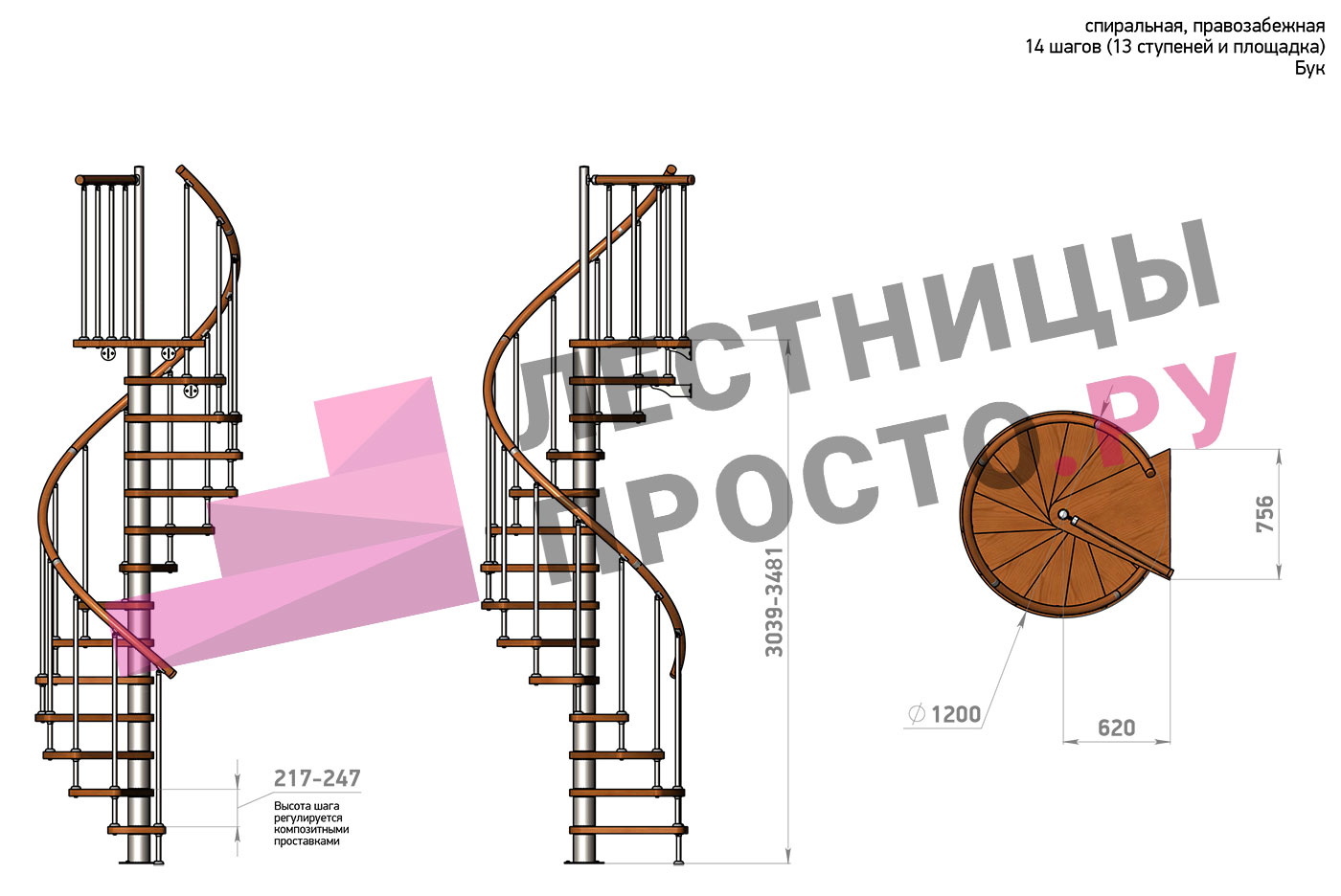Правая, d=120см, 14 ступеней + площадка