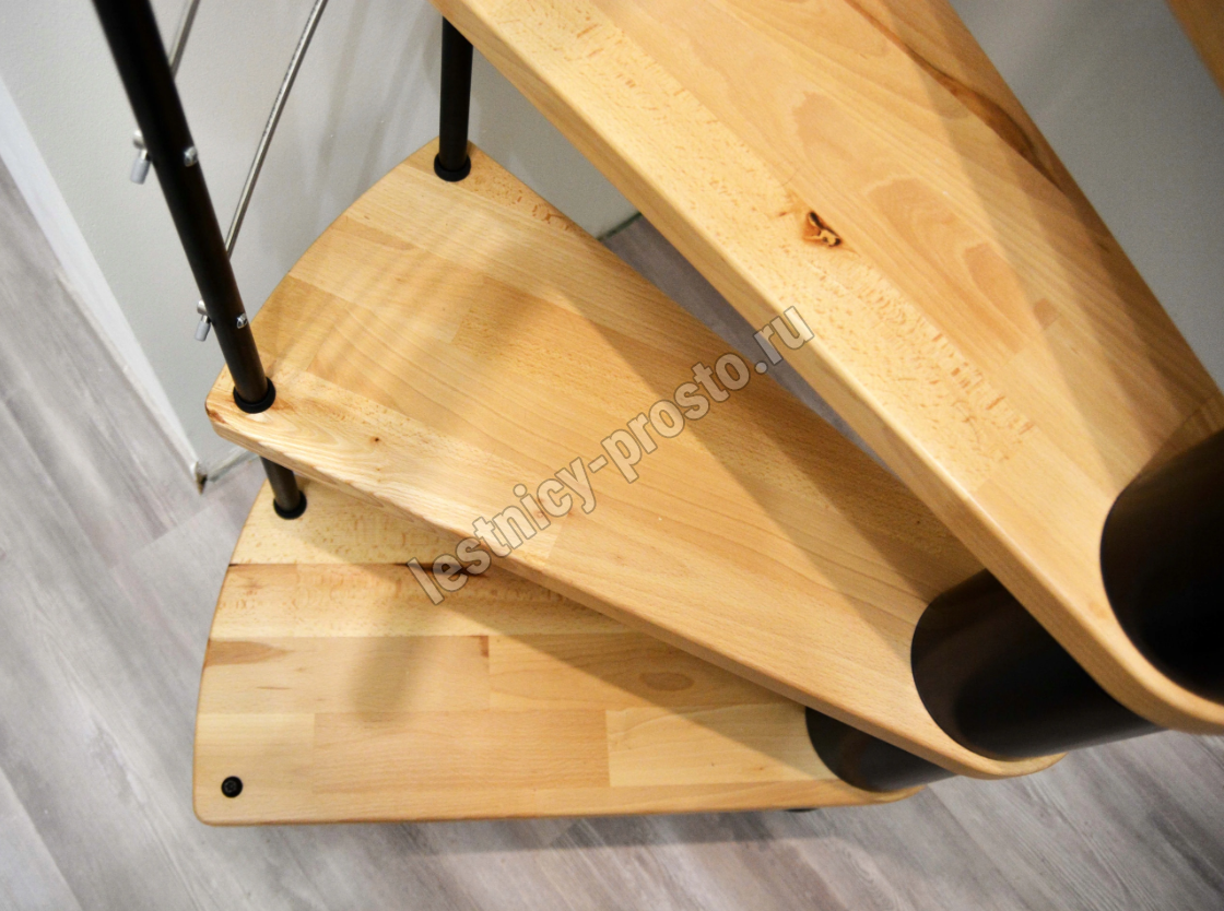 Cтупени и поручень изготовлены из массива бука и покрыты специальным лаком от компании Минка, который предотвращает царапины, сколы или стирание поверхности при интенсивном использовании лестницы. Благодаря возможности регулировать высоту шага с помощью пластиковых вставок (входят в базовый комплект), высоту лестницы можно варьировать в пределах от 2860 до 3090 мм. Кроме того, купив дополнительную секцию для этой лестницы, можно поднять высоту до 3320 мм.